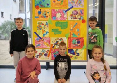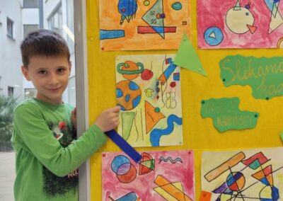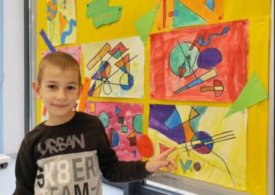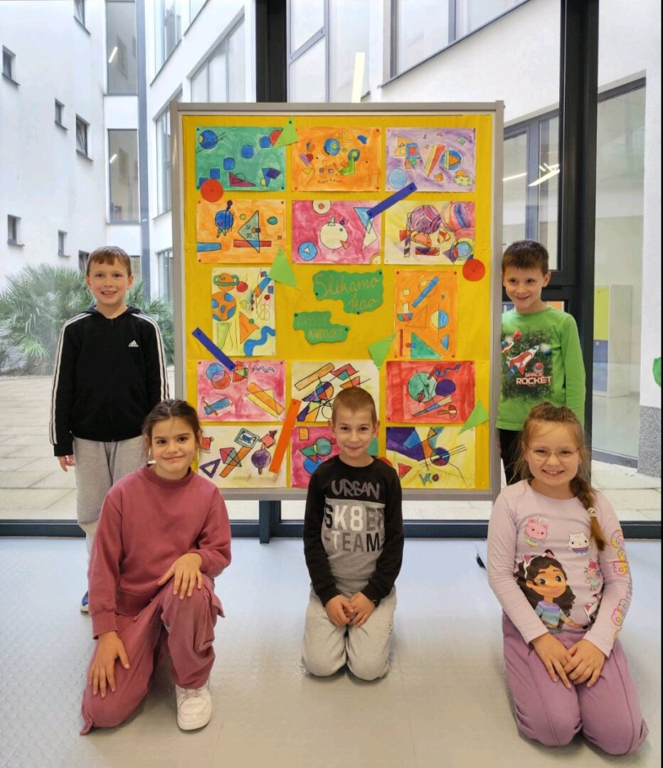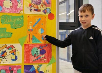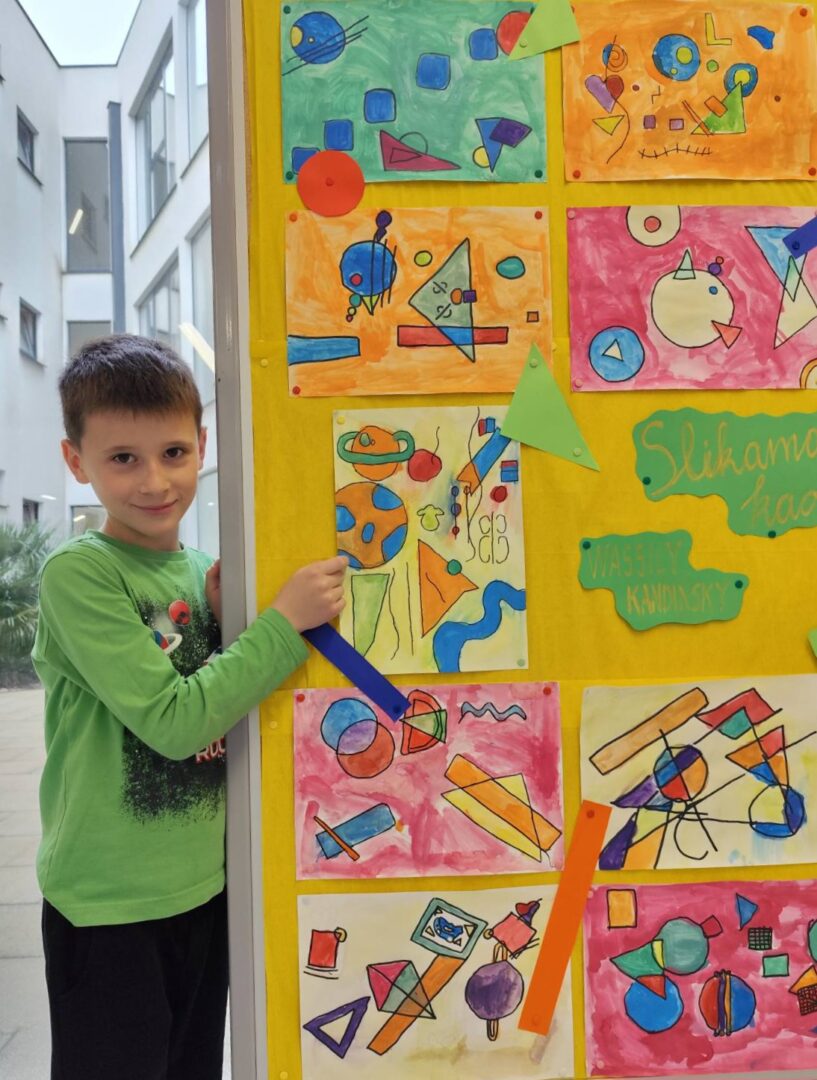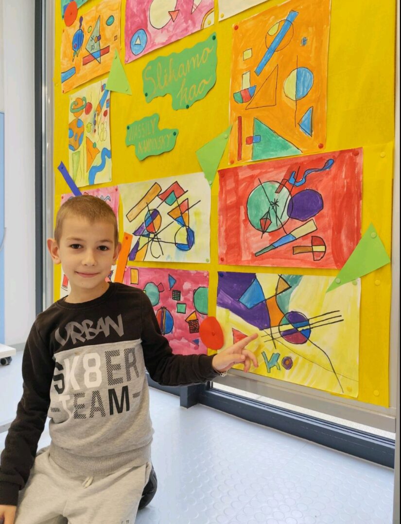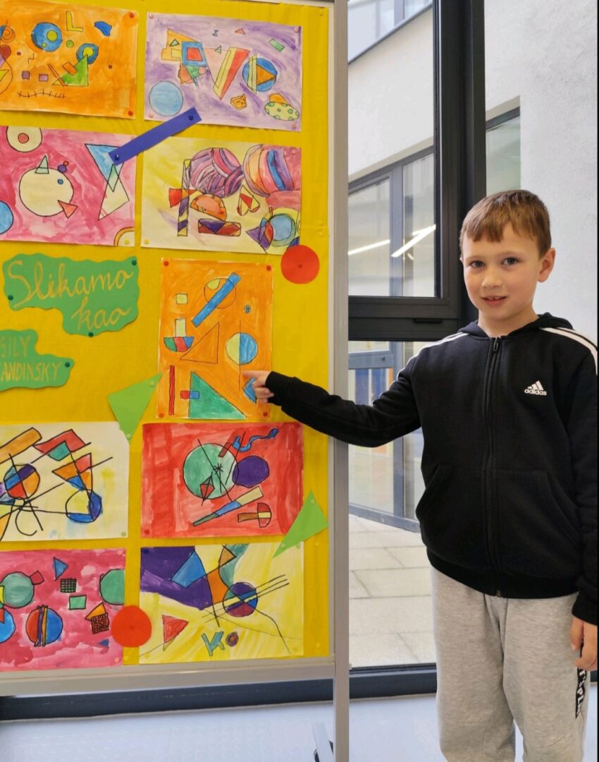Naši mali umjetnici ožu 14, 2025 | Vijesti Pogledajte čaroliju boja i oblika kroz oči naših prvašića! Učenici 1.a PB inspirirali su se radovima velikog Wassilyja Kandinskog i stvorili prava mala remek-djela.