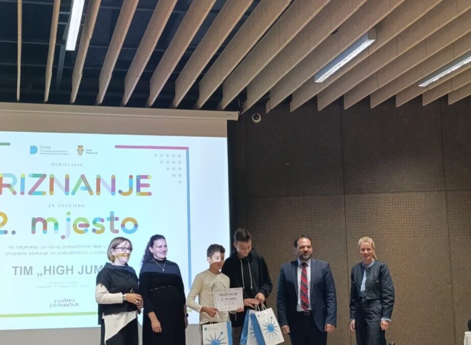 Čestitamo učenicima 7.b razreda Valu Pletikosiću, Vitu Grdoviću i Mauru Di Liddu, članovima tima „High Jump“, koji su u projektu „Poduzetništvo u osnovnim školama“ osvojili sjajno 2. mjesto!